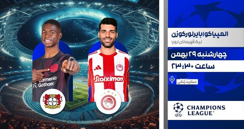 به گزارش ایسنا، شبکه ورزش فوتبال تیم های المپیاکوس یونان و بایرلورکوزن آلمان لیگ قهرمانان اروپا ۲۰۲۶ ـ ۲۰۲۵ را امشب چهارشنبه ـ ۲۹ بهمن ـ از ساعت ۲۳:۳۰ با گزارشگری سعید زلفی و به صورت زنده پوشش خواهد داد.